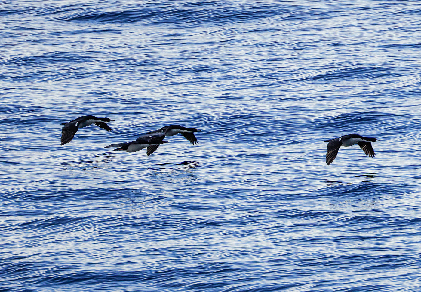 Hier waren Antarktische Kormorane unterwegs – immer in kleinen Gruppen, tief über dem Wasser. Auf Deutsch heißen sie „Blauaugenscharben“.