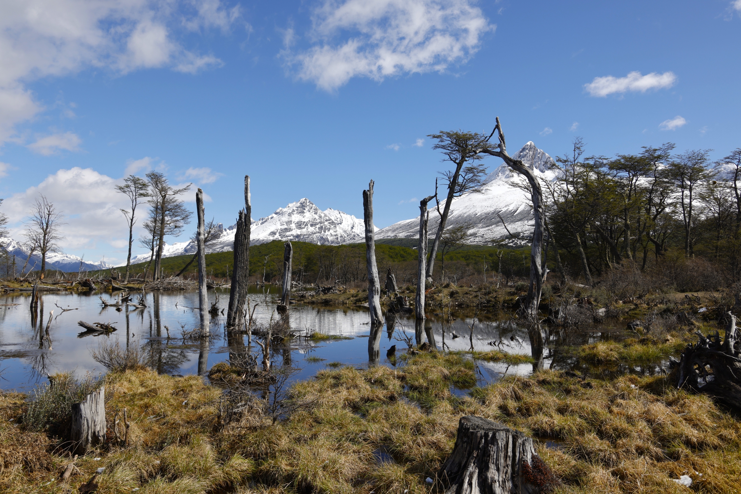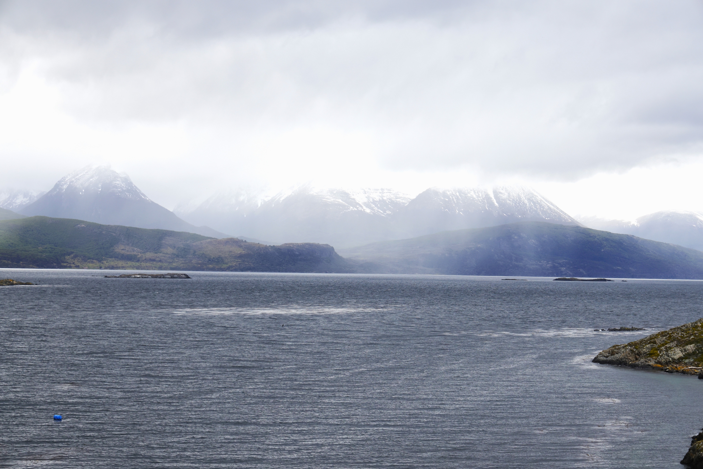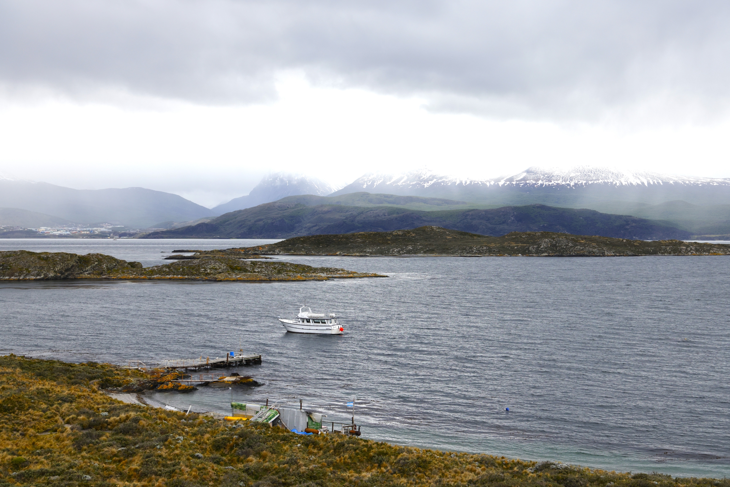 This is a view of the Beagle Channel, named after Charles Darwin’s ship, which sailed through this connection between the Atlantic and Pacific to the Galapagos Islands. On the other side lies Chile. The uninhabited islands belong to Argentina and were also fought over during the Falklands War. The Argentinian navy is currently training here.