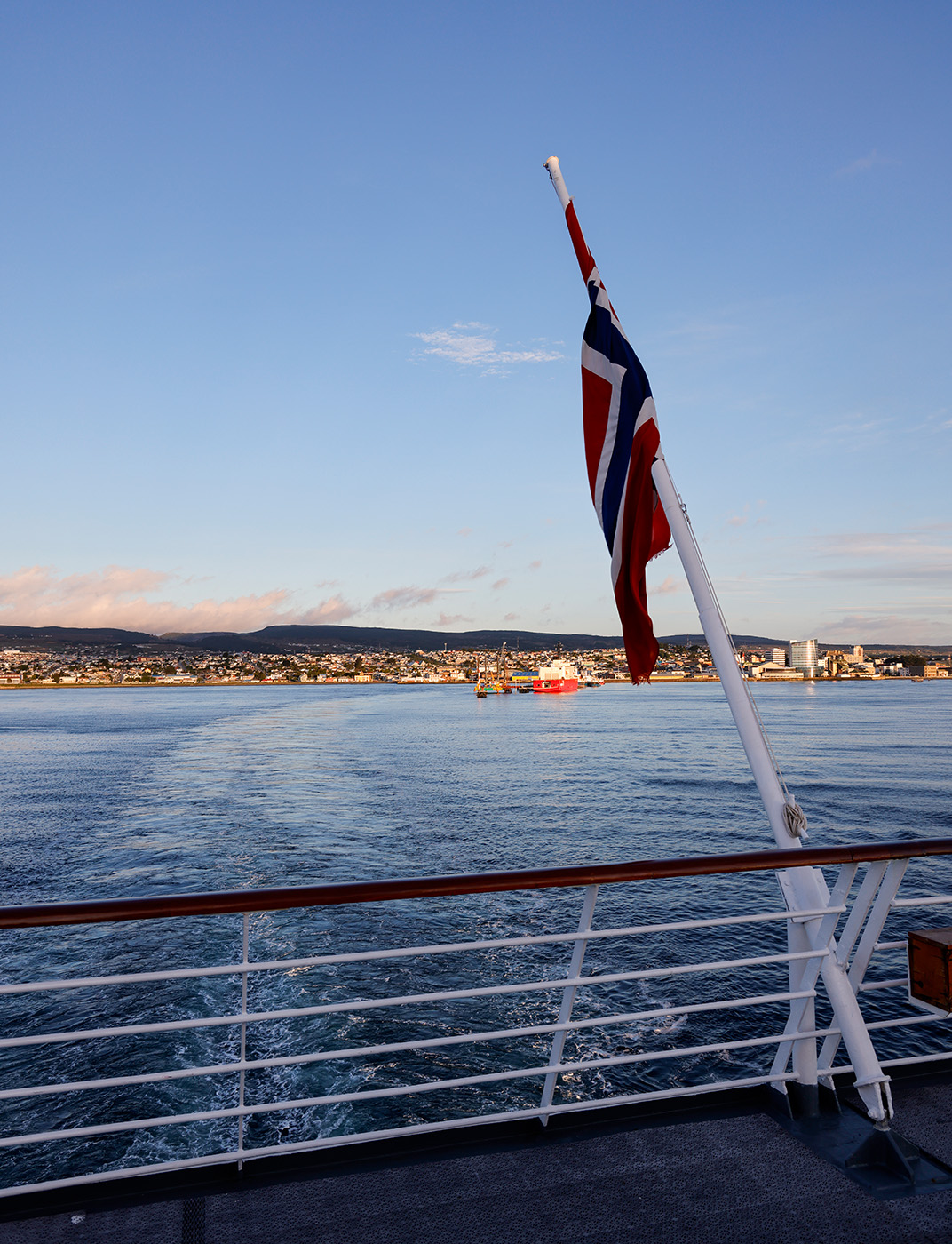 Bei bestem Wetter fuhr die Fram mit 13,5 kn durch die Magellanstraße in Richtung Osten, auf den Atlantik zu. Ziel sind zunächst die Falklandinseln. Die Reise geht über 450 Seemeilen (ca. 830 km) – das dauert also ca. 33 Stunden, je nach Wetter auch etwas länger.