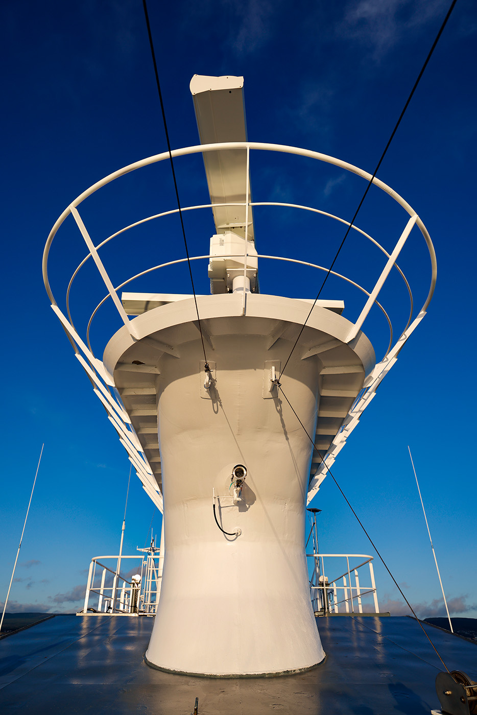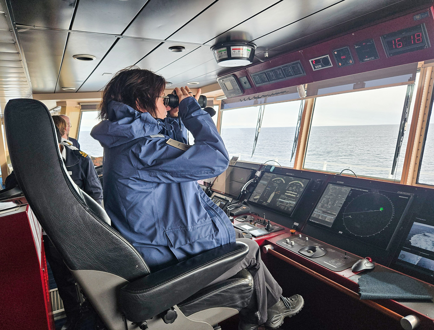 Gegen Nachmittag gab es die Gelegenheit, die Brücke zu besichtigen, die wir natürlich gerne genutzt haben – Steffie auf dem Stuhl des Kapitäns: