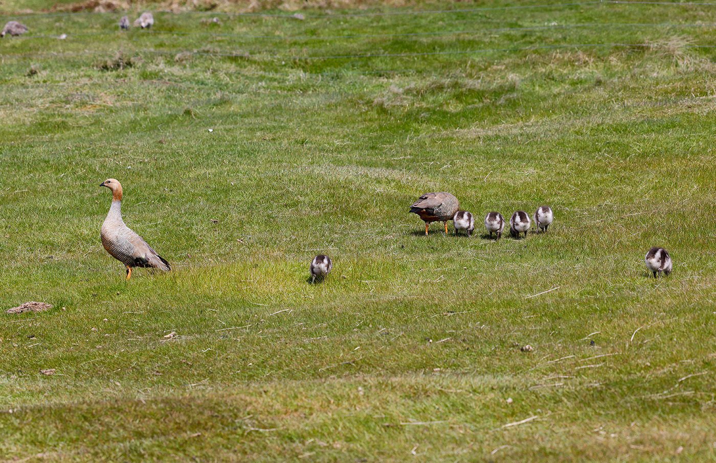 Auf der Insel leben viele Vogelarten. Die meisten davon haben keine große Fluchtdistanz, da sie mit Menschen offenbar keine schlechten Erfahrungen gemacht haben. Man kommt auf wenige Meter heran. Hier trafen wir auf einen Langschwanzstärling, eine Familie Rotkopfgänse und eine Magellangans.