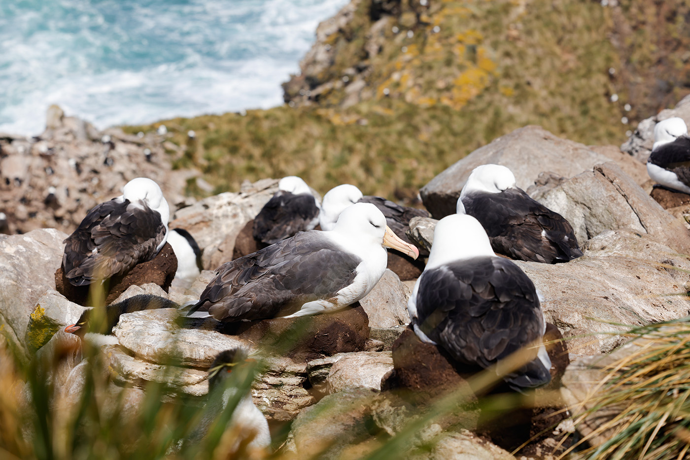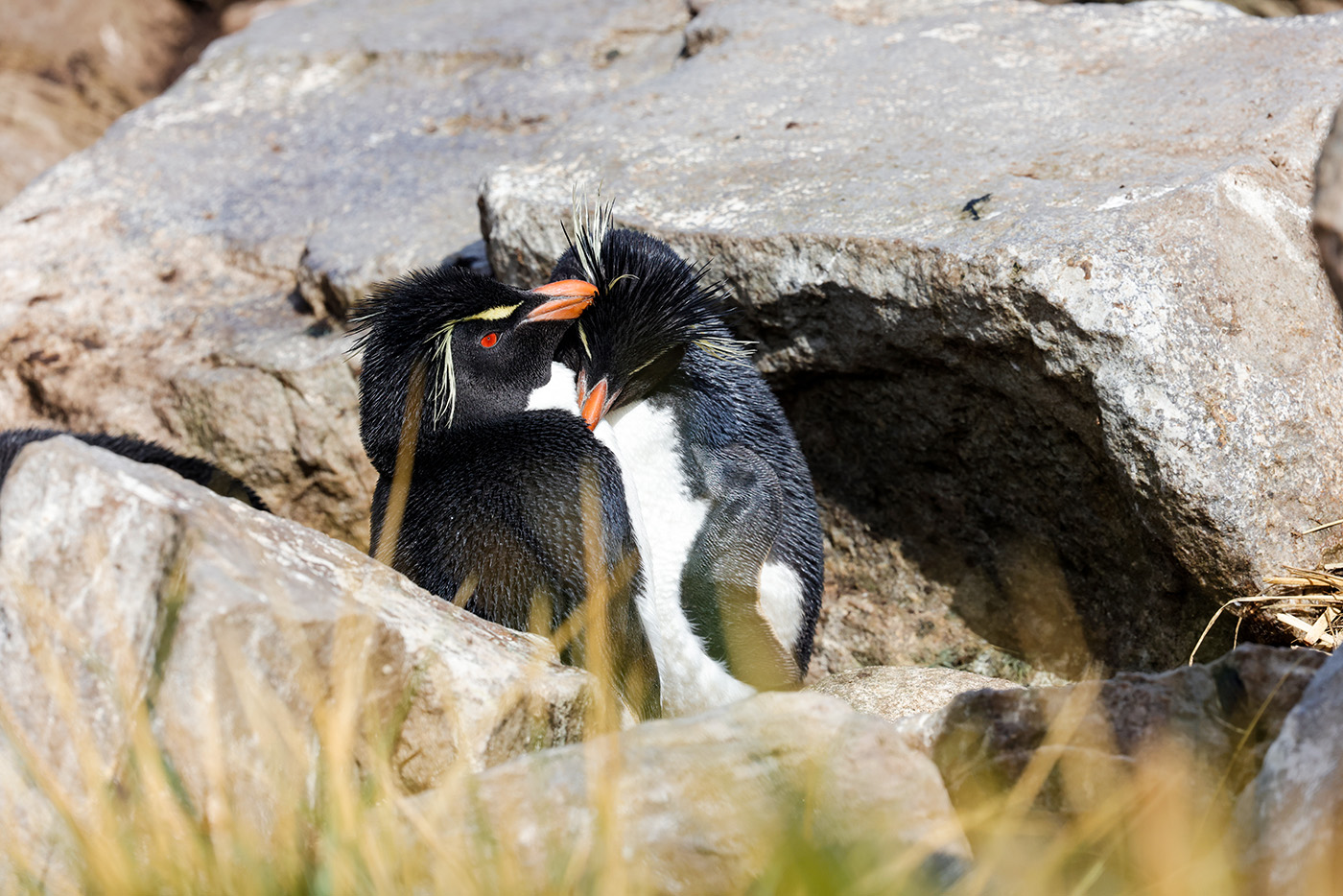 Eine kurze Wanderung brachte uns über einen Hügel zu einer Kolonie aus Felsenpinguinen (hier Rockhopper genannt) und Schwarzbrauenalbatrossen. Beide Arten nisten gemeinsam in einer Kolonie – offenbar gibt es eine Symbiose, die beiden Arten nutzt. Jedenfalls sind Fressfeinde nicht weit – Truthahngeier flogen über der Kolonie Kreise auf der Suche nach Aas.