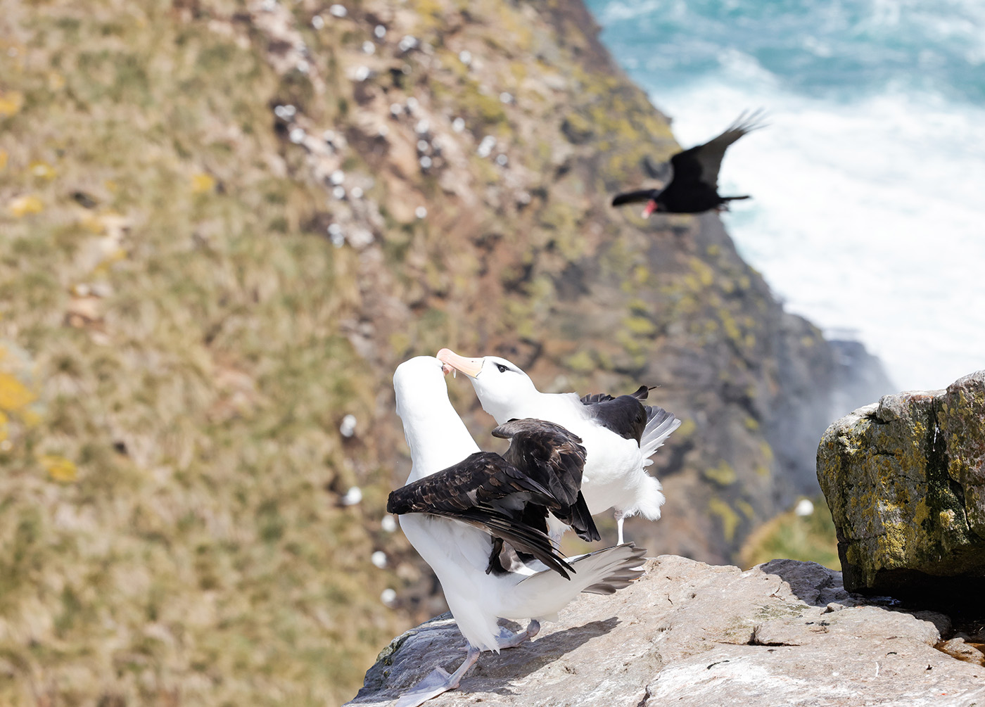 Hier schnäbeln zwei Albatrosse und von hintern nähert sich ein Truthanhgeier.