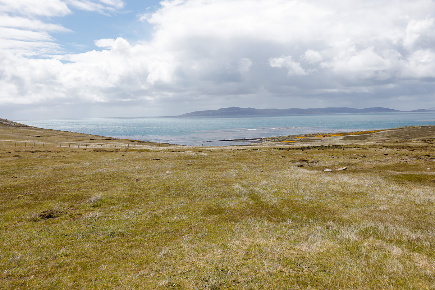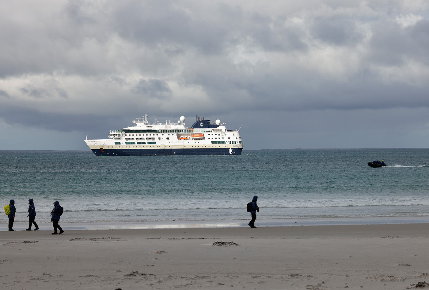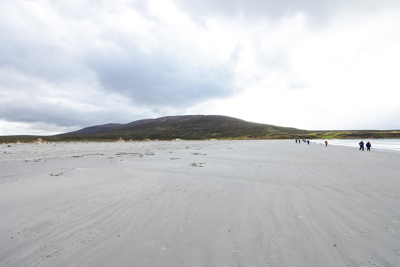 Um 16.30 Uhr erreichten wir Saunders Island, eine etwas größere Insel, die auch bewohnt ist – von Schafen, Kühen, Menschen – und Pinguinen. Wir landeten bei etwas bedecktem Himmel direkt an einem flachen Sandstrand an.