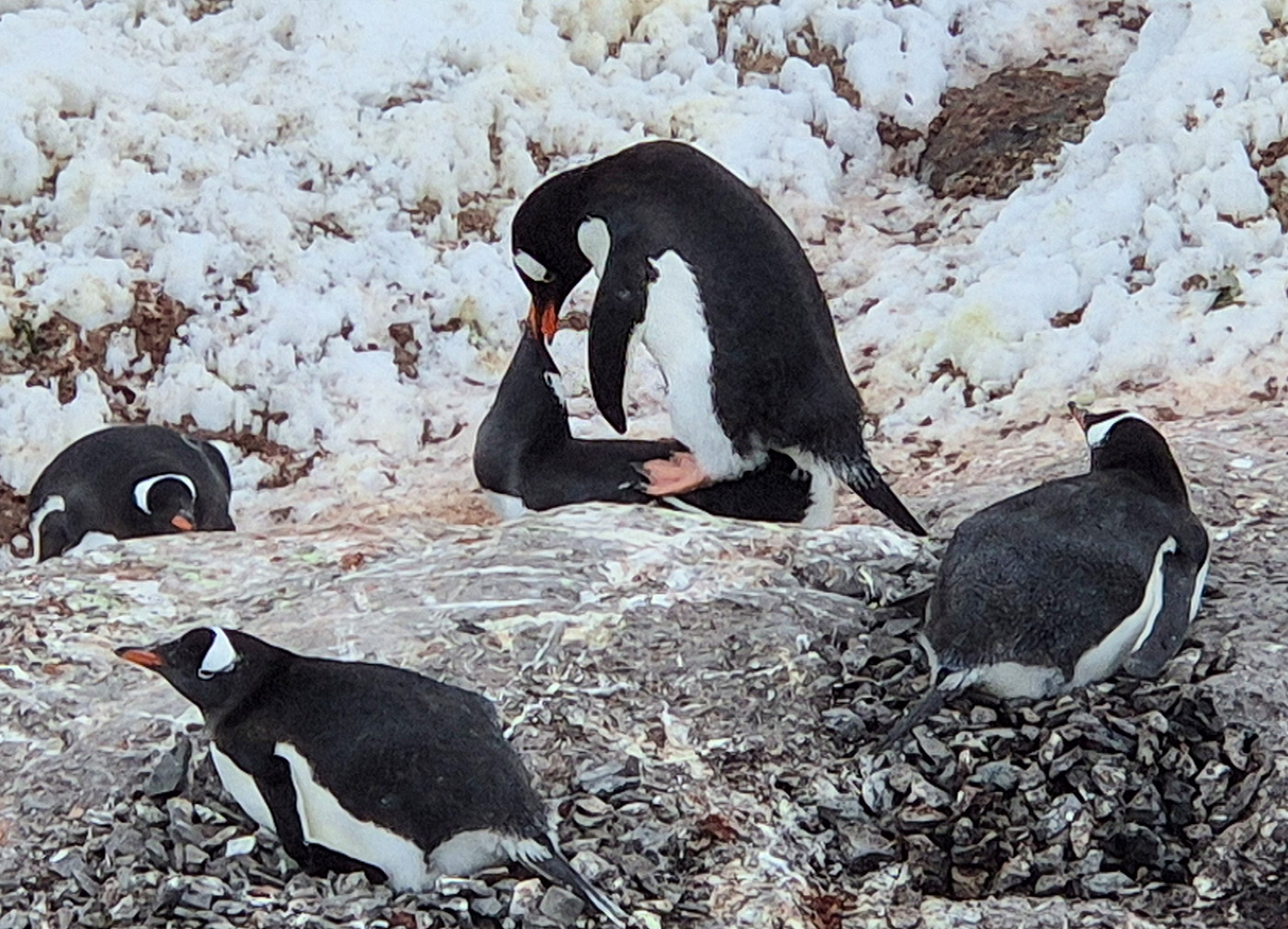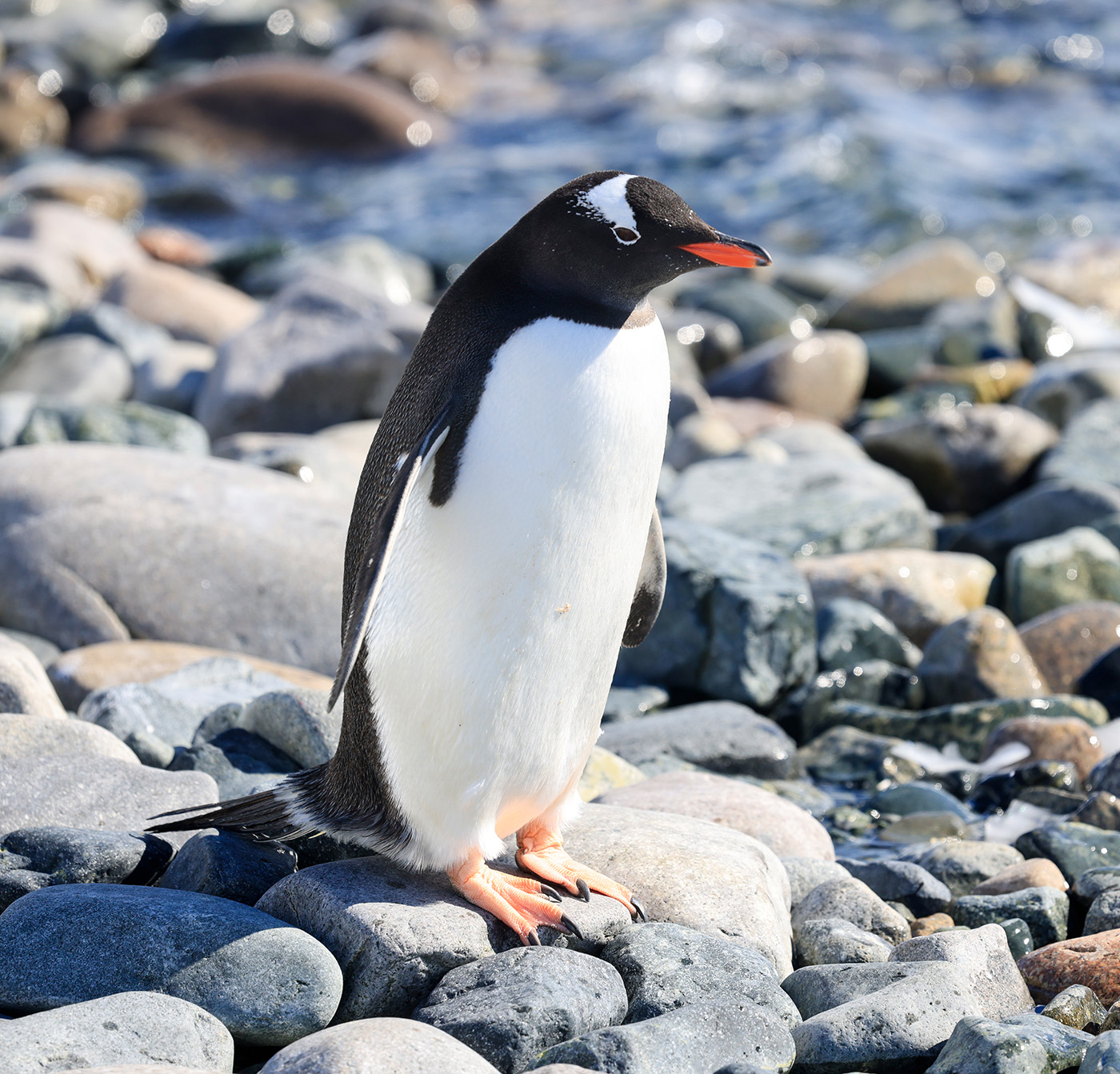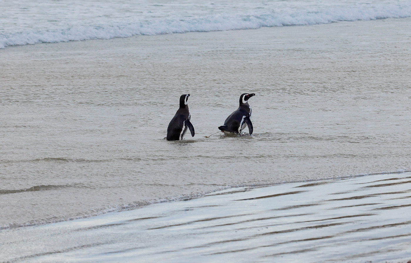 Besonders interessant: Auch hier leben mehrere Arten in einer gemeinsamen Kolonie: Eselspinguine (zu erkennen an einem hellen Fleck auf dem ansonsten schwarzen Kopf) und Magellanpinguine (mit weißen und schwarzen Streifen an den Seiten). Beide Pinguinarten sind in etwa gleich groß und scheinen sich gut zu verstehen. Völlig unbeeindruckt von den blau gekleideten Zweibeinern verteilen sie sich über den ganzen Strand.