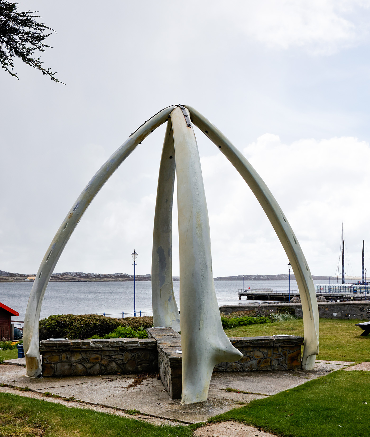 Dieses Foto zeigt die Ross Road, die Hauptstraße, direkt am Ufer entlang. Mittig zu sehen die Christ Church Cathedral mit einem Monument aus Blauwal-Kieferknochen. Das Monument steht hier im Gedenken an die Walfänger, die Teil es historischen Erbes der Inseln sind.
