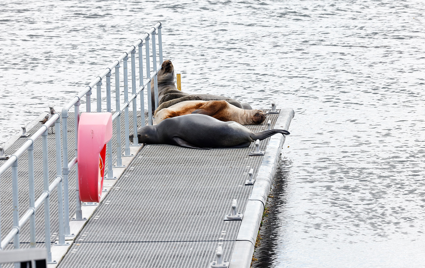Auf dem Steg, direkt gegeüber des Touristenzentrum lagen diese Gesellen faul in der Sonne und verteidigten ihren Liegeplatz mit heiserem Gebrüll gegen aufgrindliche Seevögel: Südamerikanische Seelöwen.