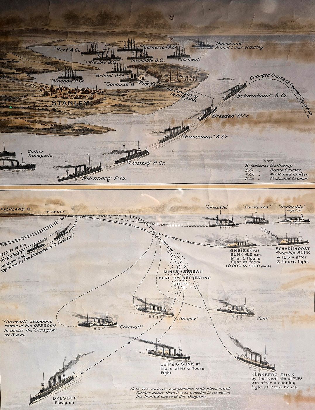 Wir besuchten auch das örtliche historische Museum. Ein Großteil der ausgestellten Artefakte behandelt die verschiedenen Versuche fremder Nationen, die Falklandinseln einzunehmen. Nicht nur der Falklandkrieg von 1982 spielt dabei eine Rolle – es gab 1914 auch einen wenig rühmlichen deutschen Angriff, der nach wenigen Stunden Seegefecht mit der Zerstörung fast aller deutschen Kriegsschiffe endete – wie auf diesem Gemälde skizziert:
