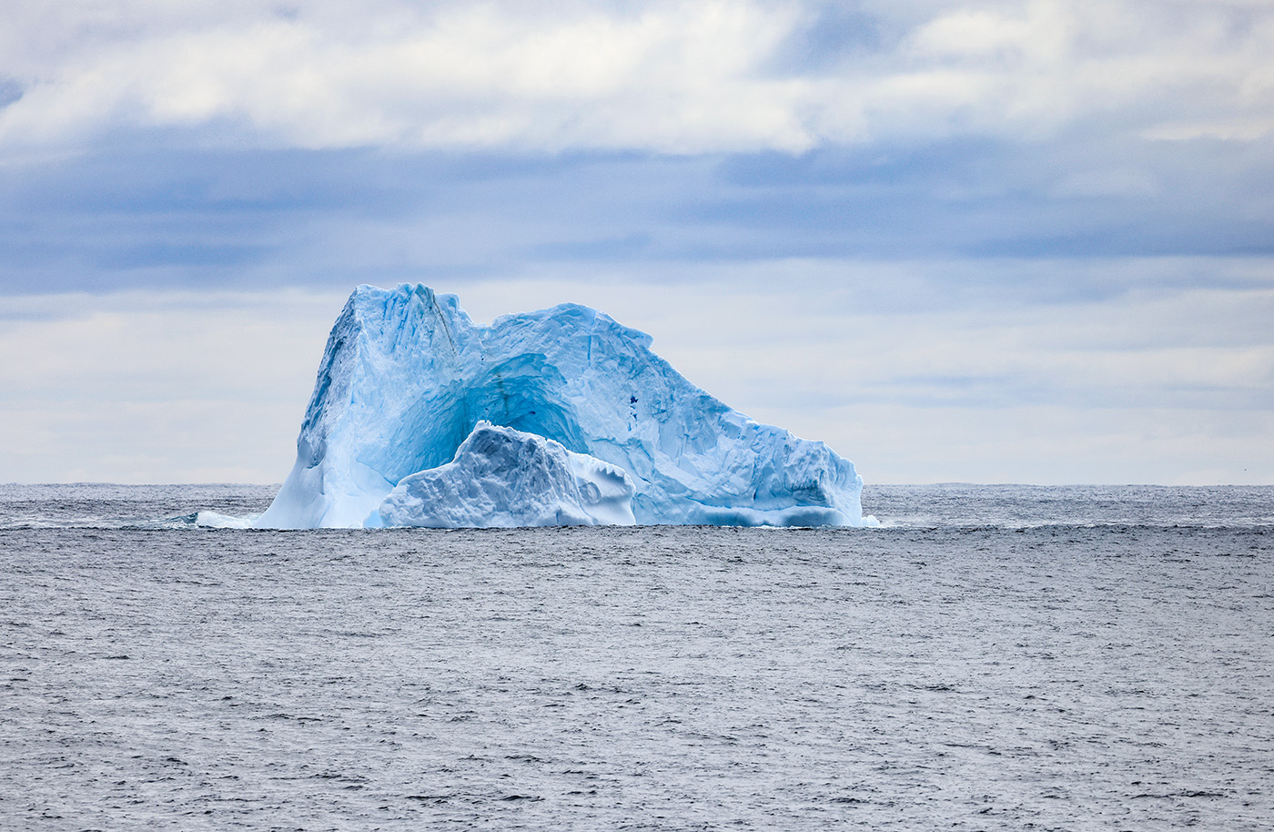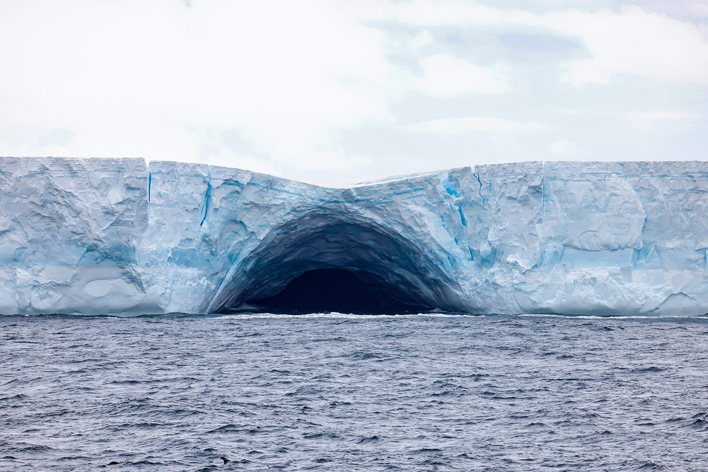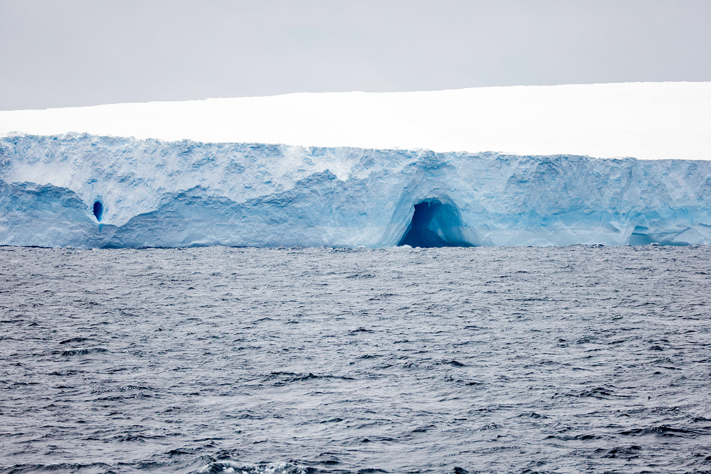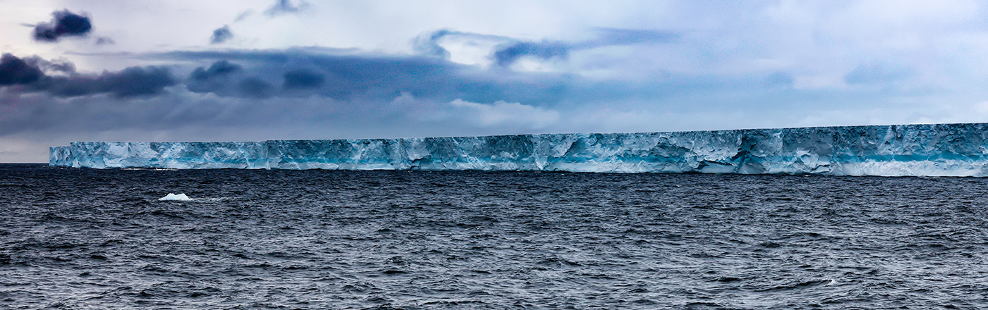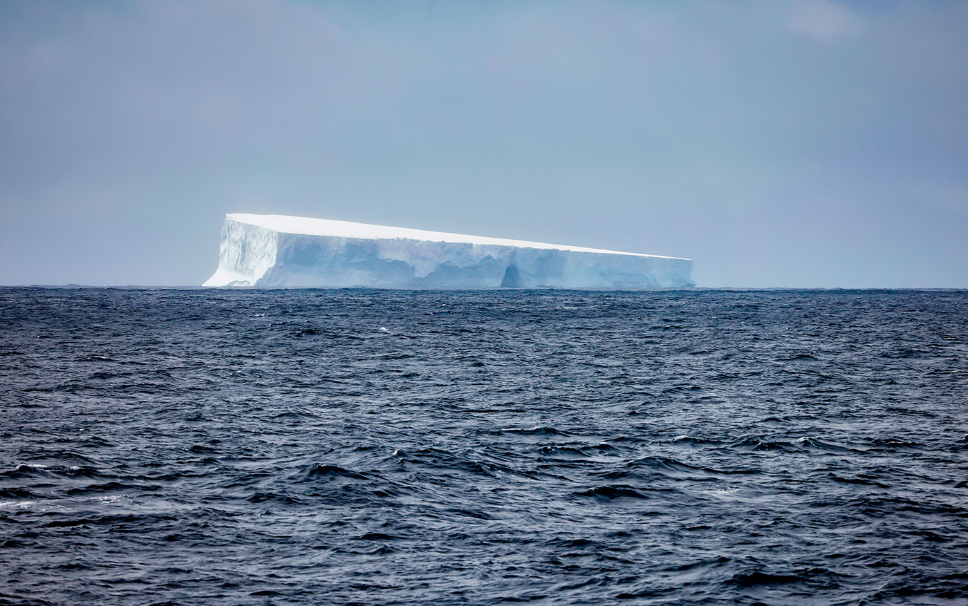 Ein unwirklicher Ort. Es sieht aus, als würde der Ozean hier in ein Loch fließen. Die Ausmaße sind gigantisch. Den Eisberg zu erfassen, ist mit einem Foto allein nicht möglich, die Eiskante geht weit über den Horizont hinaus. Das nächste Foto vermittelt aber zumindest einen Eindruck der Dimensionen.