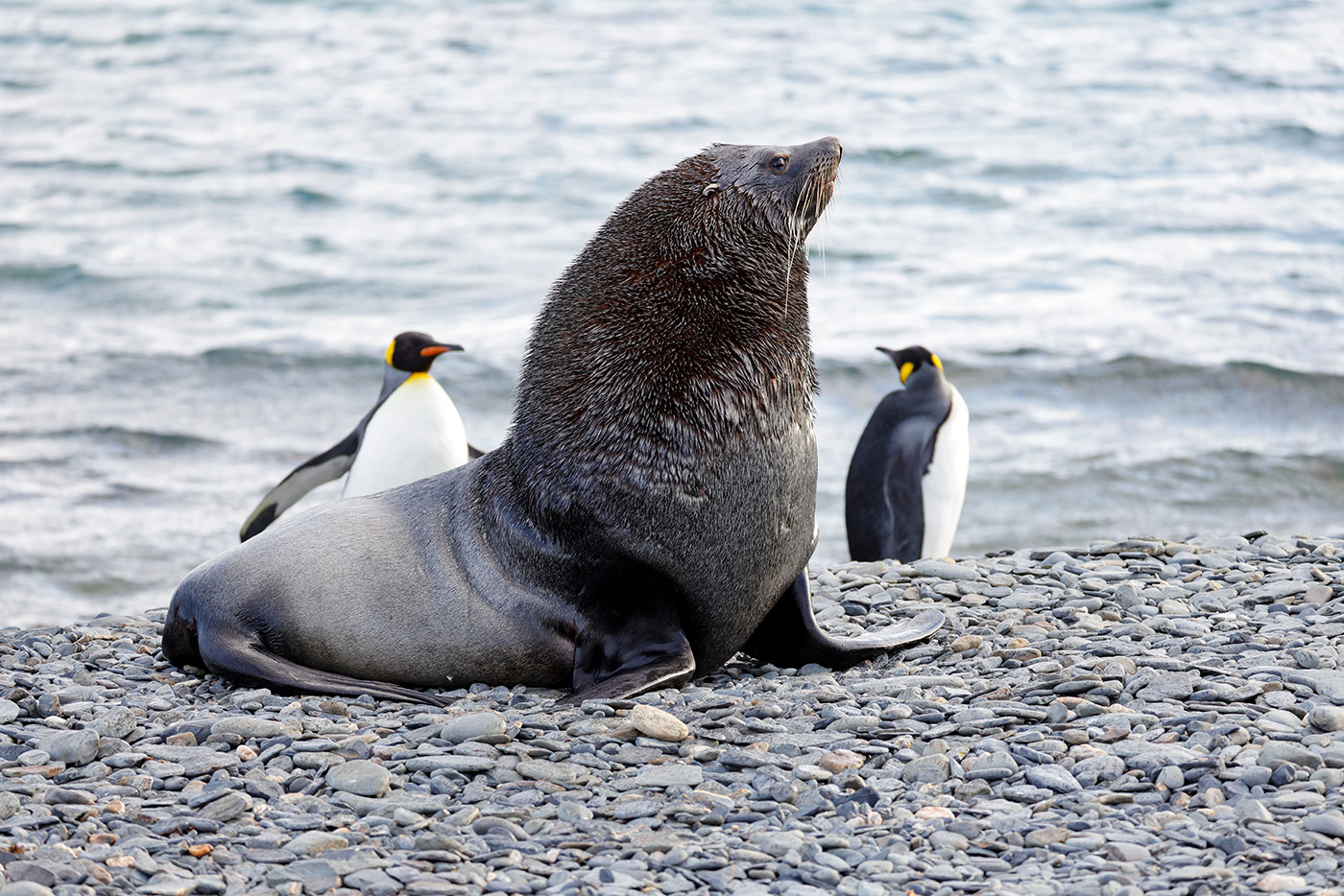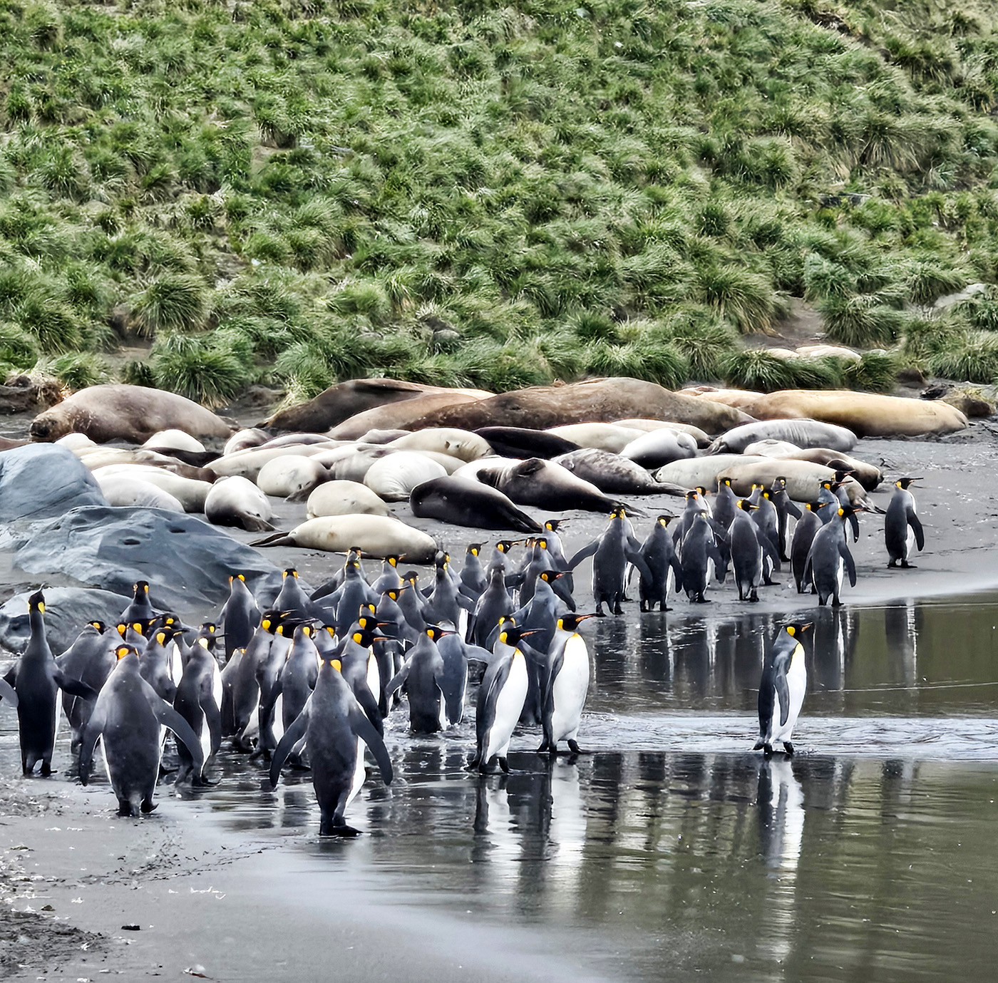 Neben Königspinguinen gibt es hier aber auch einige erwachsene See-Elefanten und vor allen antarktischen Seebären.