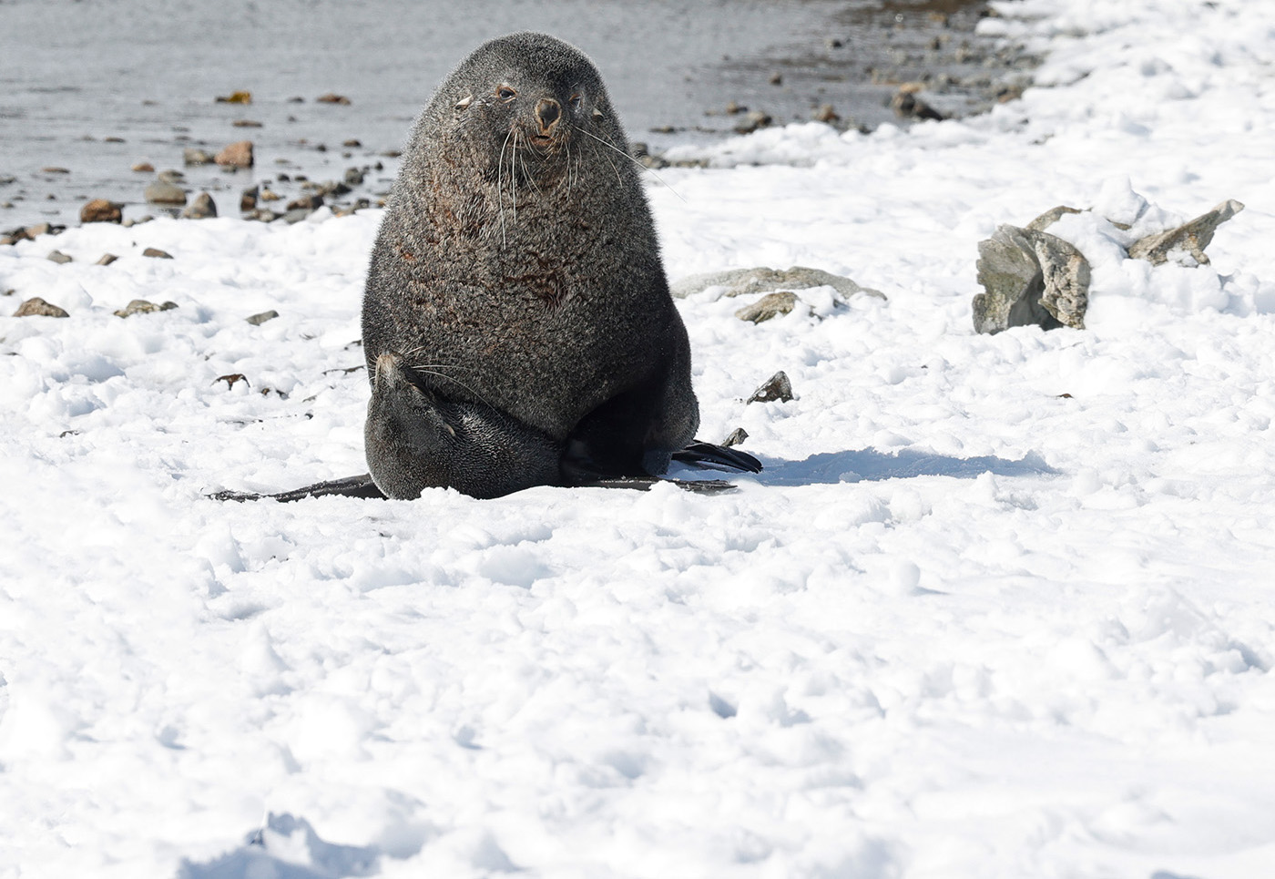 Von den antarktischen Seebären waren bislang nur die Männchen am Strand, weshalb es einigermaßen friedlich zuging. Sobald die Weibchen eintreffen beginnen die Kämpfe.