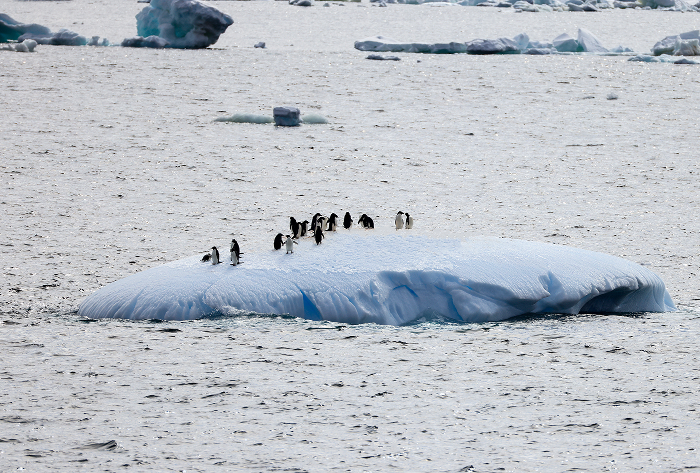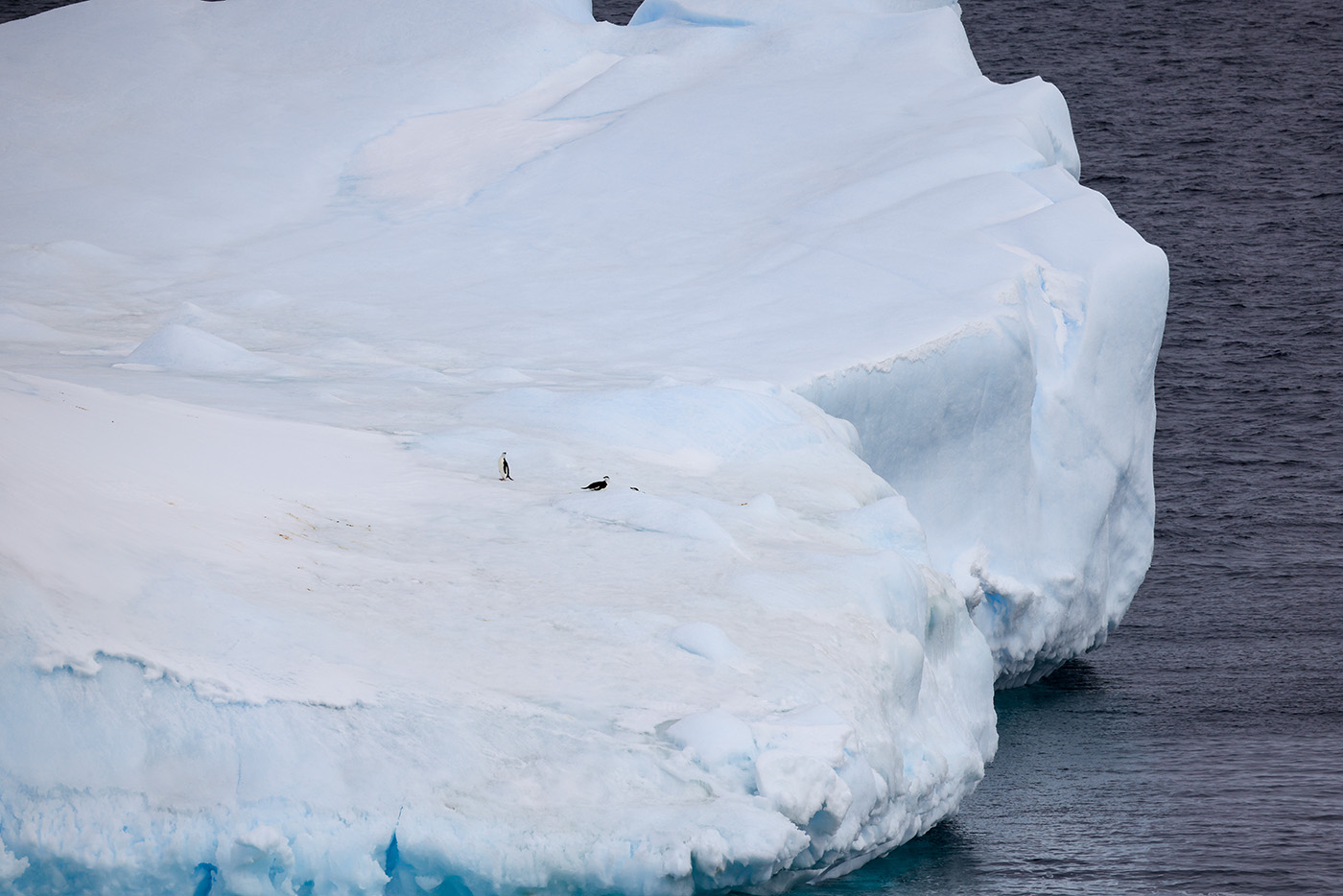 Einige Eisberge sind bewohnt. Hier konnten wir die ersten Zügelpinguine fotografieren.