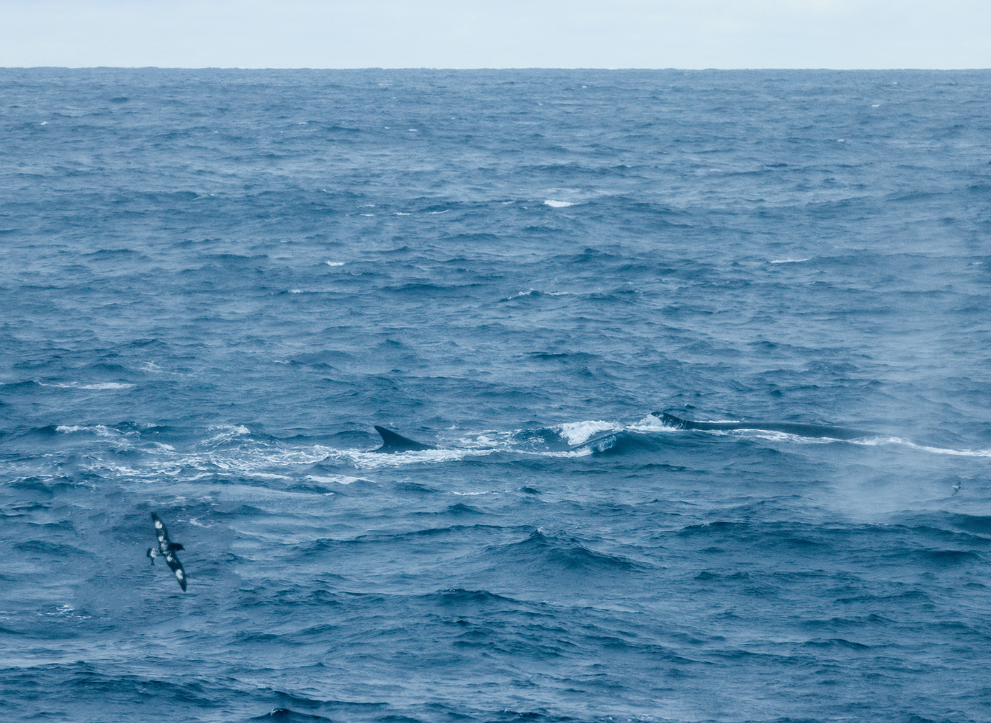 Gegen Mittag sichteten wir eine Gruppe von (mindestens) drei Finnwalen. Gesichtet hatten wir die zwar schon häufiger aber hier gelang es erstmals, sie zu fotografieren.