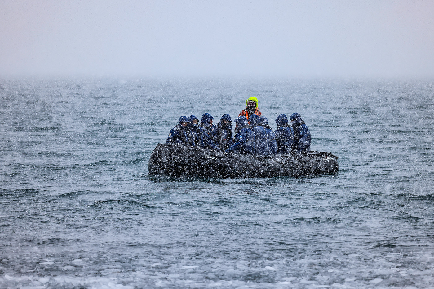 Nach etwa anderthalb Stunden ging es zurück zum Landepunkt. Die Fahrt zurück zur Fram war nass, windig und außerordentlich kalt, auch wenn die Kleidung wasserdicht ist.
