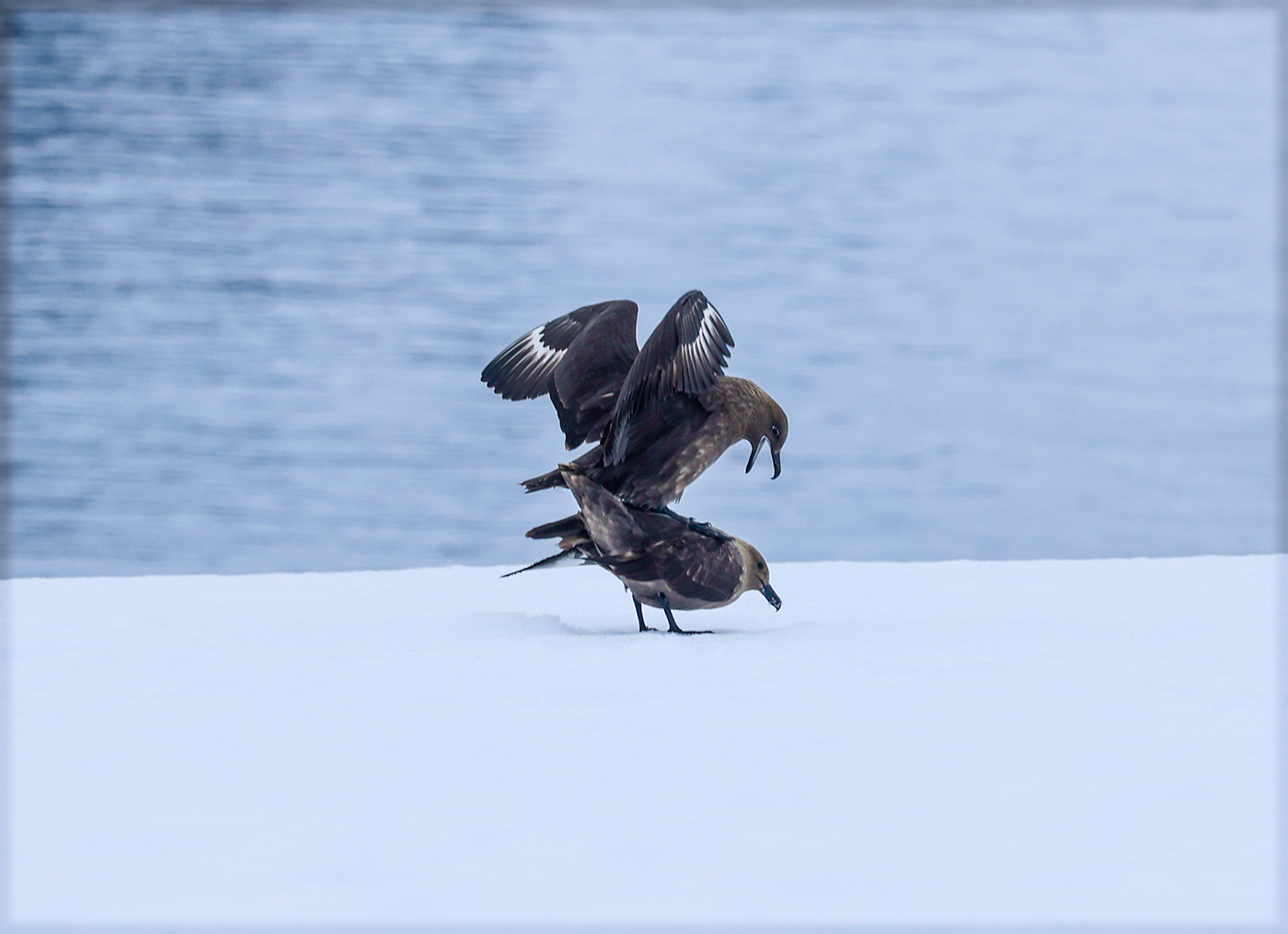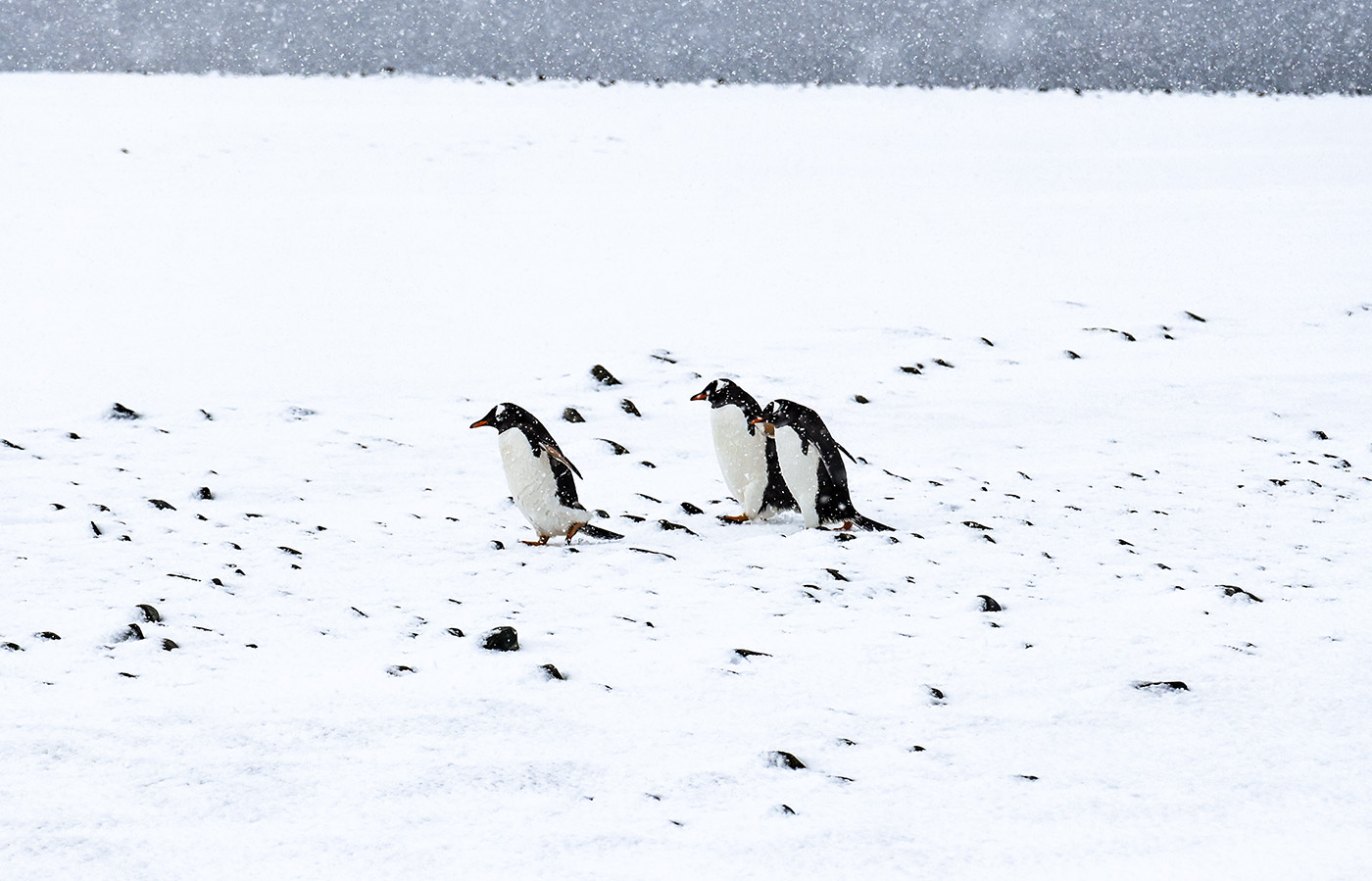 Über Nacht hatte es geschneit und die Außendecks der Fram waren weiß, als wir aufwachten. Wir lagen in Fortuna Bay aber leider konnte die geplante Anlandung nicht stattfinden. Hier gab es zu viel Wellengang und außerdem nicht viel zu sehen – allenfalls Pinguine im Nebel.