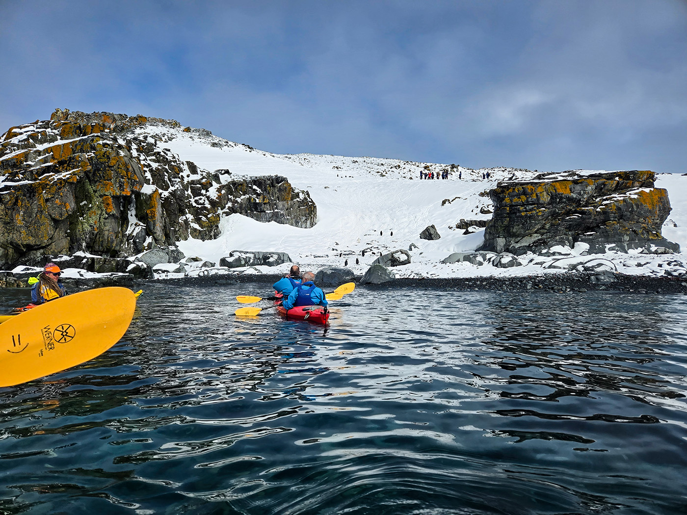 Nach kurzer Zeit in der Kälte ging es wieder an Bord und weiter nach Half Moon Island. Das scheint tatsächlich einer der schönstem Orte hier zu sein. Wir parkten in einer Bucht vor Half Moon Island, was wiederum in einer Bucht von Livingston Island liegt. Hier absovierten wir unsere Kajaktour bei bestem Wetter.