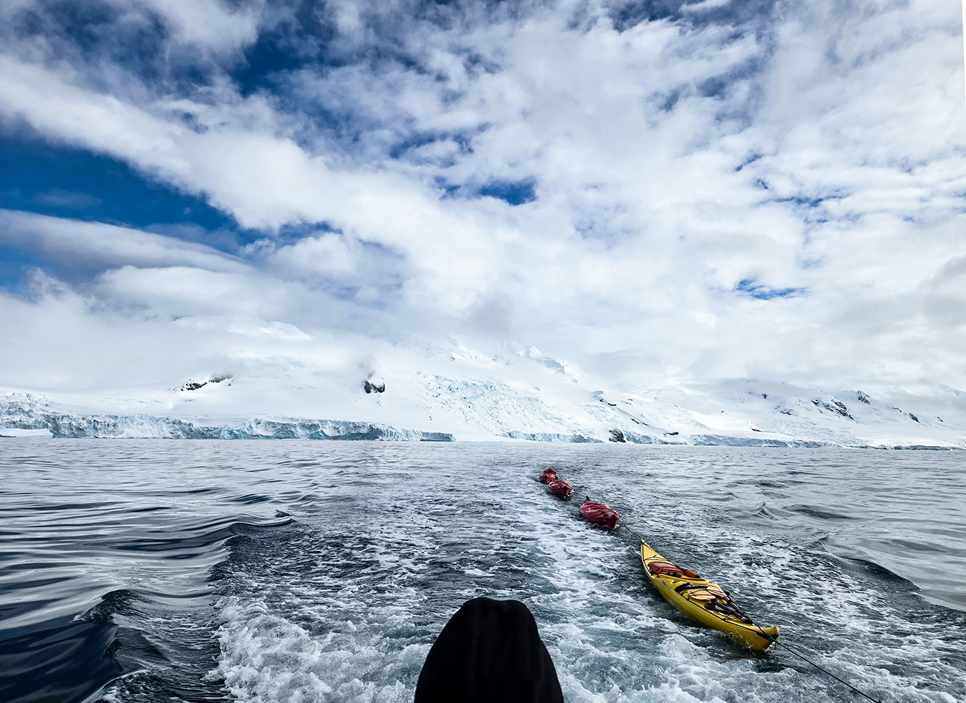 Dann wurden wir von einem Schlauchboot abgeholt, das die leeren Kajaks ins Schlepptau nahm.