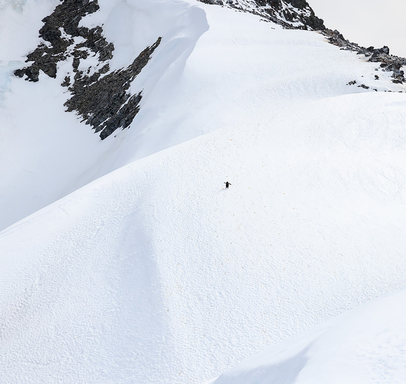 Danach landeten wir im Fjord an und stiegen einen vereisten Berghang hinauf. Oben nisteten Zügelpinguine. Man fragt sich schon, warum die dreihundert Meter den Berg raufklettern, wo sie eigentlich auch unten brüten könnten. Alles, was hier potenziell Eier klauen könnte, hat Flügel und kommt besser den Berg hoch, als ein Pinguin.
