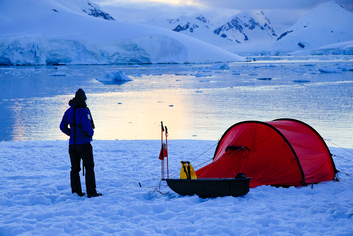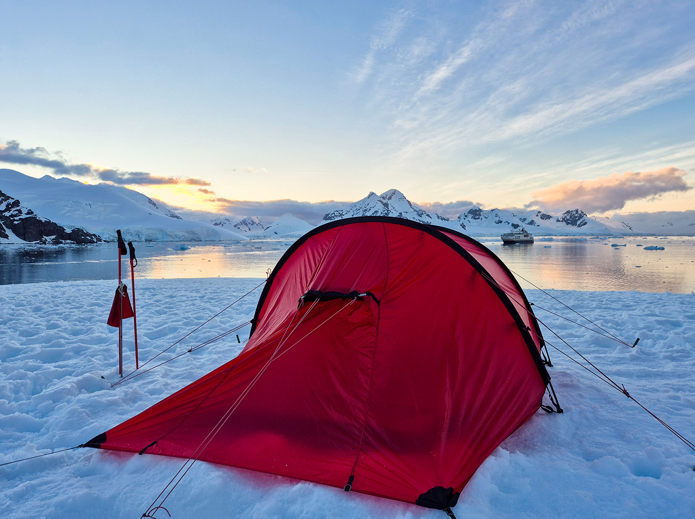 Hier verbrachten wir die Nacht in einem Zelt, Das war eine einzigartige Erfahrung und gehört zu den schönsten Erlebnissen, die wir bisher auf einer Reise hatten. Die tiefstehende Sonne beschien die Szenerie bis spät in die Nacht (hier ist Sommer und wir waren auf fast 65° Süd). In den antarktistauglichen Schhlafsäcken war es einigermaßen warm. Rundum herrschte gespenstige Stille, die gelegentlich von einem Donnern unterbrochen wurde, das vom Kalben eines der Gletscher herrührte.